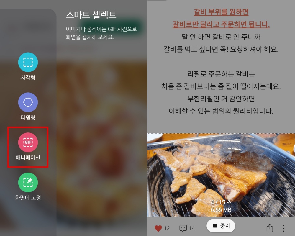 갤럭시 스마트 셀렉션 기능은 움짤 뿐만 아니라 갤럭시 화면캡쳐를 간단하게 하기에도 좋습니다.