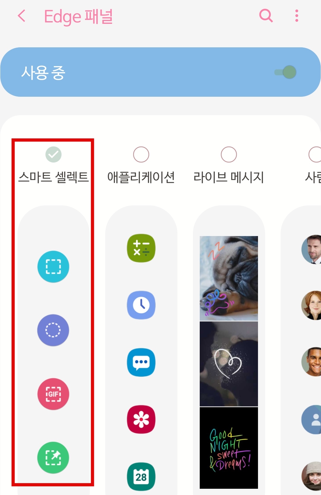 엣지패널 옆에 있는 동그라미가 초록색이 되었으면 사용 중으로 설정이 된 겁니다.