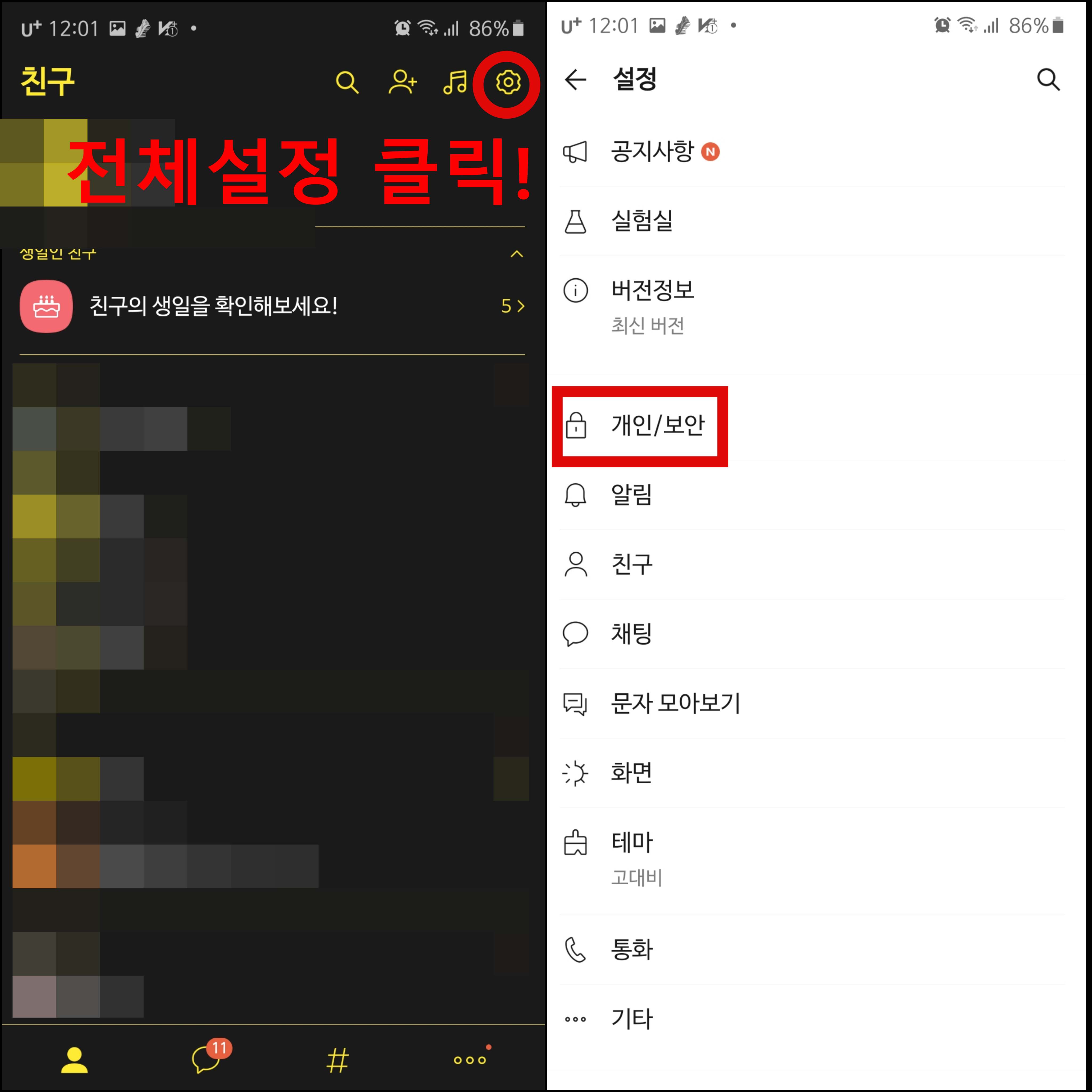 그러면 편집 - 친구관리 - 전체설정 세 가지가 뜨는데요. 그 중에서 카카오톡 전체설정을 클릭해주세요. 전체설정을 클릭하면 오른쪽 화면이 뜰텐데요. 빨간 네모 박스인 개인/보안을 눌러 주세요.