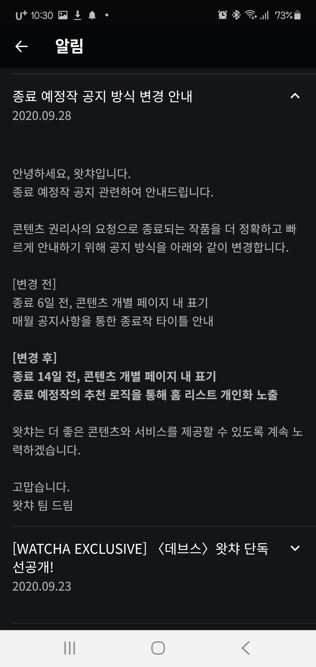 왓챠에 접속해서 공지에 들어가면 원래 왓챠 종료 예정작을 띄워줬었는데 어느 순간 그 공지들이 안 뜨더라고요. 대신 왓챠 콘텐츠에 개별 페이지에 표기하는 방식으로 바뀌었습니다.