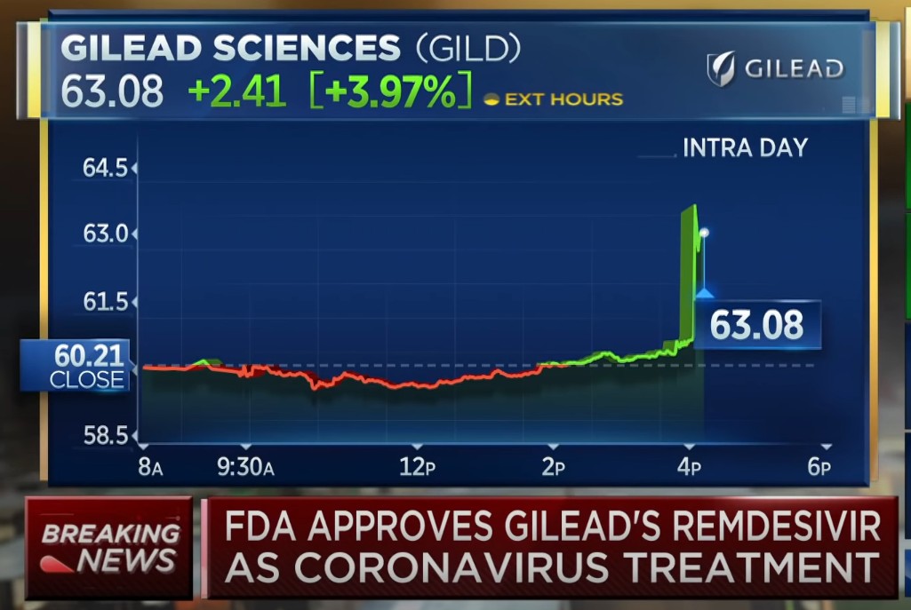그러나 미국에서 코로나19 정식 치료제로 승인을 받았기 때문에 렘데시비르 관련주들은 득을 보고 있는 상태인데요.