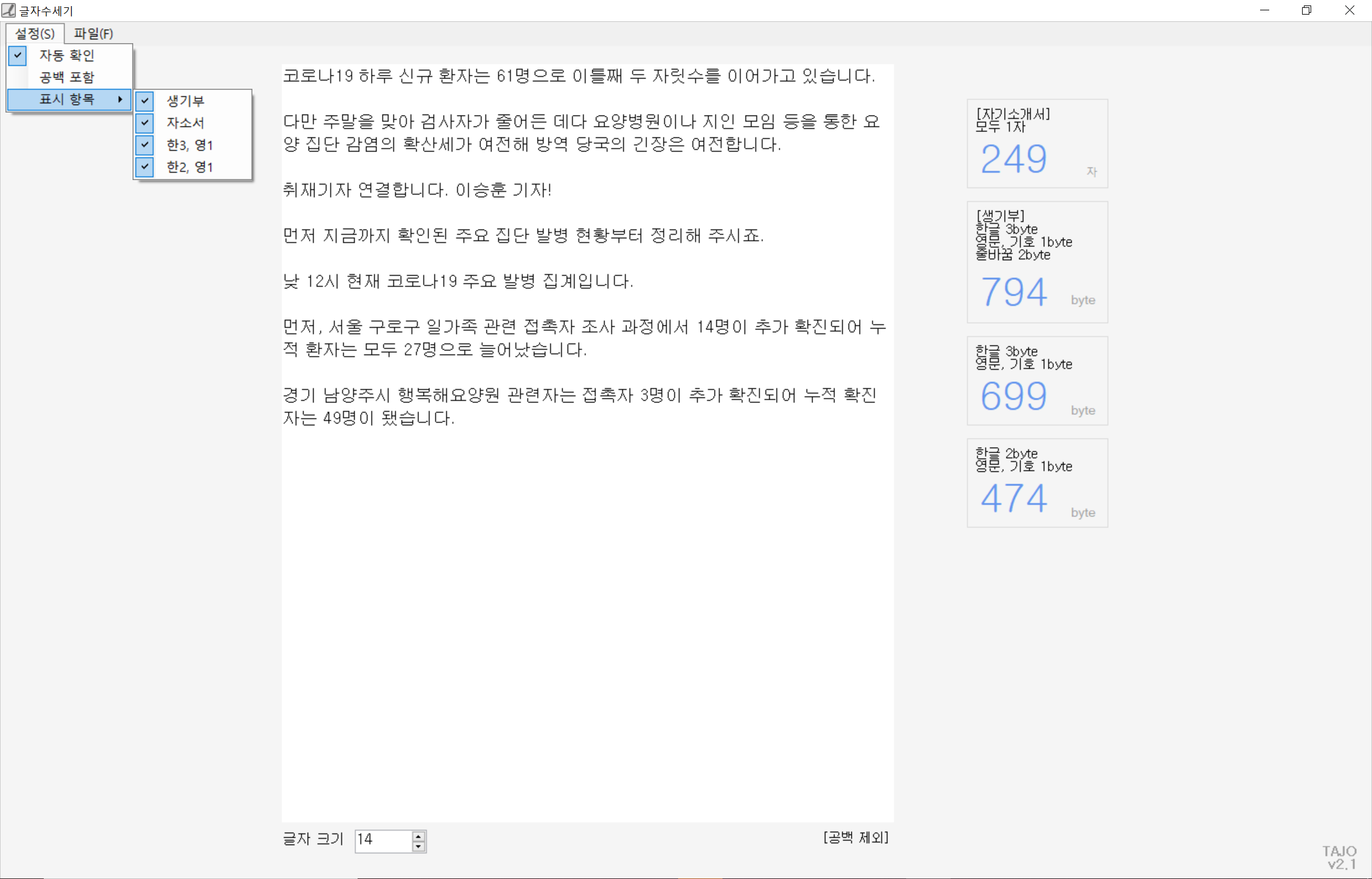 아예 표시항목을 다 설정한 후에 띄우고 이런식으로 작업해도 편하더라고요. 오히려 네이버 글자수세기보다 전 이 프로그램이 더 편해서 늘 사용하고 있습니다.