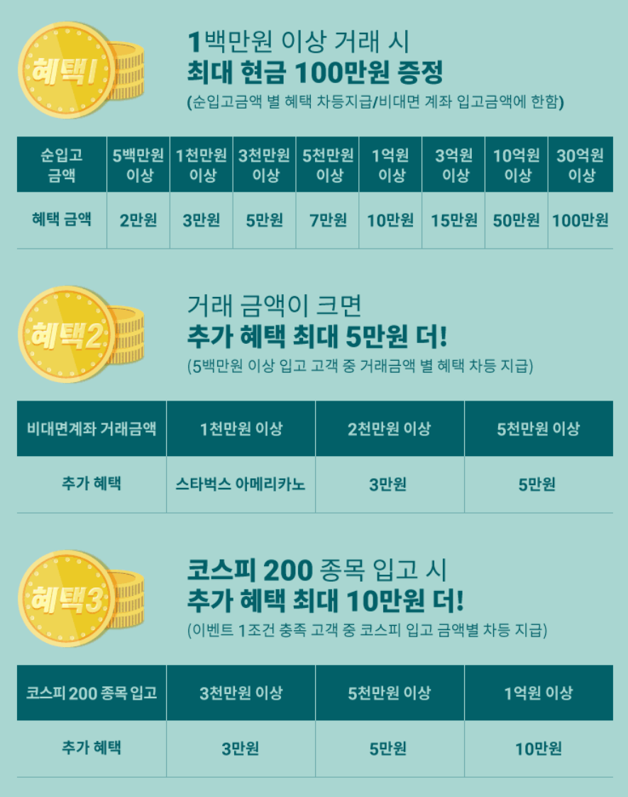 만약 키움증권이 주식 계좌 첫 거래가 아니라면 다른 증권사 계좌에서 주식옮기기를 하고 혜택을 받는 방법도 있는데요. 키움증권 비대면 계좌로 이벤트 기간 내 500만 원 이상 다른 증권사 계좌에서 입고를 한 고객 중이 100만 원 이상 거래를 체결한 고객을 고객을 대상으로 최대 현금 100만 원 증정하는 이벤트를 하고 있습니다. 관심있으시면 참고해 주세요.