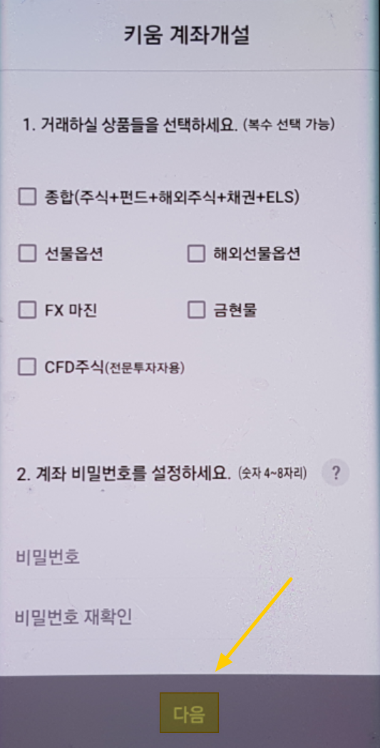 거래할 상품 상품들을 선택합니다. 상품 선택은 본인이 원하는 것 하면 됩니다. 그리고 계좌 비밀번호를 설정하면 됩니다. 계좌 비밀번호는 숫자로 설정하면 되고요. 숫자 4~8자리로 하면 됩니다. 그 후 다음 버튼 클릭합니다.