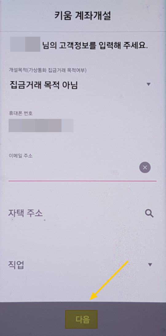 3. 키움증권 계좌개설에서 본인의 고객정보를 입력해 줍니다. 자금원천 및 출처, 계좌개설 목적, 미국인 여부, 내국인 여부, 국내거주 여부, 실소유자 여부를 본인에 맞게 체크한 후 다음 버튼 클릭합니다. 개설목적 (가상통화 집금거래 목적여부)를 체크하고 주소와 휴대폰 번호 등 개인 정보를 입력하고 다음 버튼 클릭합니다.