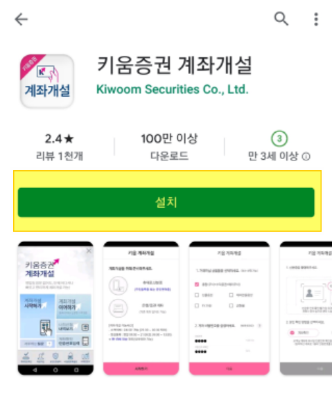 1. 구글 플레이스토어(paly스토어)에서 키움증권 계좌개설을 검색합니다. 키움증권 어플 설치 버튼 클릭해주고 다운 받습니다.