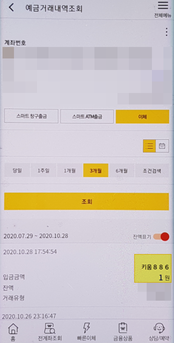 1원입금 확인의 경우 아까 입력한 본인의 계좌에 키움증권에서 1원을 입금해주면 계좌 확인 후 1원입금에 써진 인증번호를 입력하는 방식입니다.