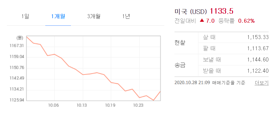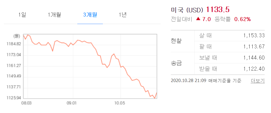 하지만 아직은 그 움직임을 조심해야 한다는 의견이 대부분입니다. 원달러 환율 현재 최고 저점이라고 생각해 환차익을 노리고 해외주식을 구입하거나 달러 예금에 투자하는 것에 신중할 필요가 있다고 합니다. 원 달러 환율이 아직은 추가 하락의 가능성이 높습니다.