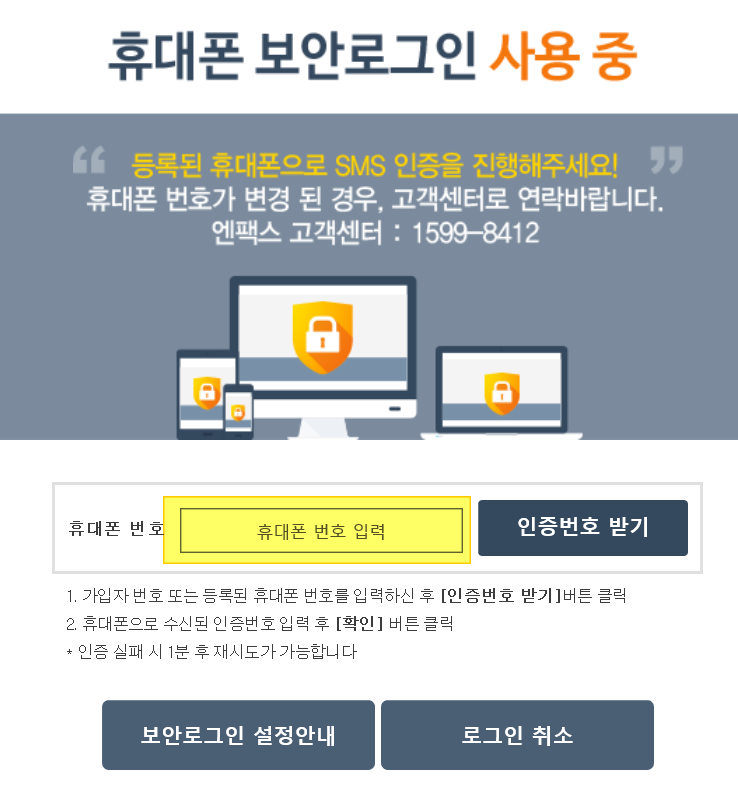 휴대폰 보안로그인 화면이 뜨는데에서 휴대폰 번호 입력 후 인증번호 받기를 클릭합니다. 휴대폰으로 인증번호가 왔다면 인증번호 입력하면 휴대폰인증 완료 화면이 뜹니다.