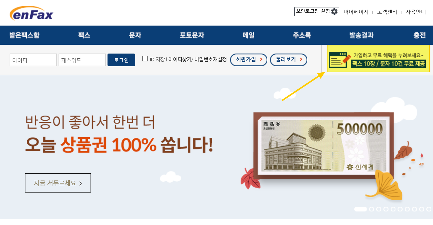 무료 인터넷팩스 사이트 엔팩스에 들어가면 메인 화면 상단 우측에 가입하고 무료 혜택을 누려보세요~ 팩스 10장/문자 10건 무료 지급이라고 써진 화면이 보입니다. 그 부분을 클릭합니다.