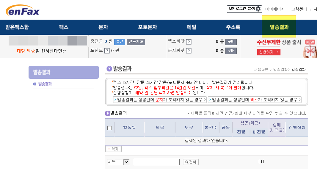 9. 마지막으로 팩스를 잘 보냈다면 엔팩스 메인 화면에서 발송결과를 클릭해서 내가 보낸 팩스가 잘 갔는지 확인할 수 있습니다. 그냥 팩스도 마찬가지지만 인터넷팩스도 도착하는데 시간이 꽤 걸리는 편입니다. 보통 몇 분 이상은 걸리니까 좀 시간 지난 후에 확인하면 됩니다.