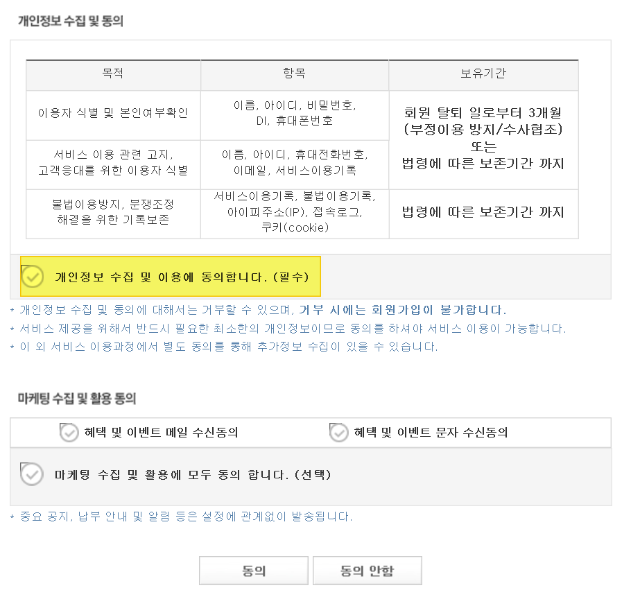 2. 본인이 사용할 유형에 맞는 가입을 합니다. 보통 개인 가입자일테니 개인가입 클릭하고 가입하면 됩니다. 가입 버튼을 클릭하면 회원가입 창이 뜨는데요. 광고가 귀찮다면 개인정보 수집 동의에만 체크하고 나머지 항목에는 체크하지 않고 동의 버튼 클릭합니다.
