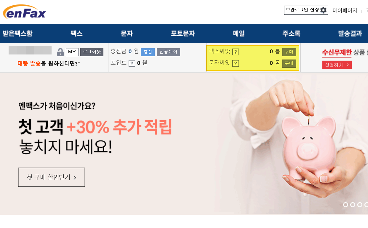 1. 먼저 엔팩스 인터넷 사이트에 들어가 주세요. enfax.ppurio.com/으로 접속하면 됩니다 .