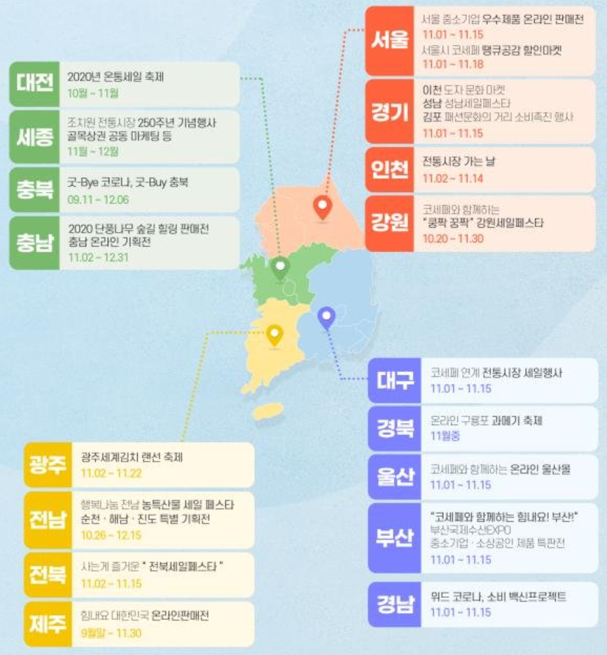 서울, 경기, 인천, 강원, 대전, 세종, 충북, 충남, 광주, 전남, 전북, 제주, 대구, 경북, 울산, 부산, 경남 각 지역마다 다양한 행사를 진행하고 있으니 코리아세일페스타 홈페이지 꼭 확인해 주세요. 다양한 행사가 진짜 많더라고요.