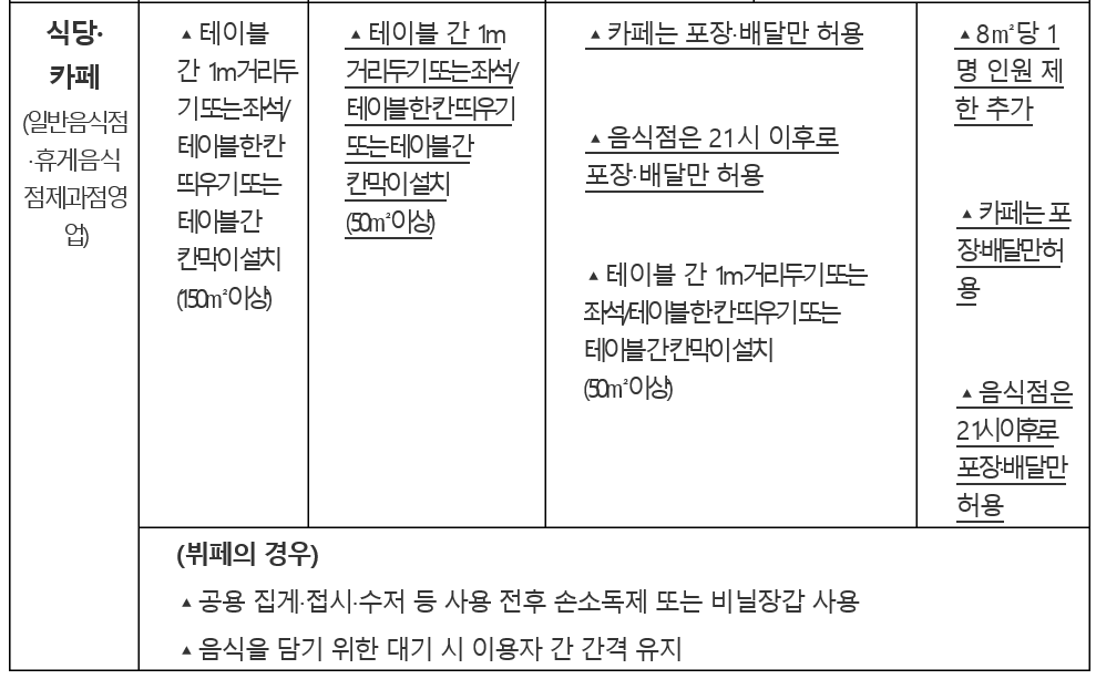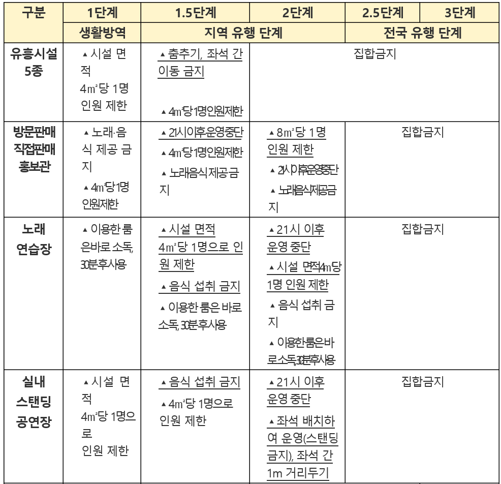 | 집합, 모임 행사 | 허용 | 실내 50인, 실외 100인 이상 금지 | 10인 이상 금지 |