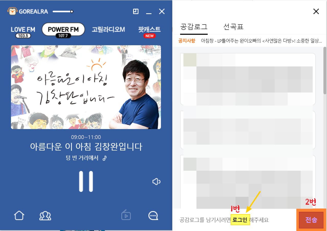 클릭하면 오른쪽에 흰색 창이 뜹니다. 공감로그와 선곡표가 뜨는데요.