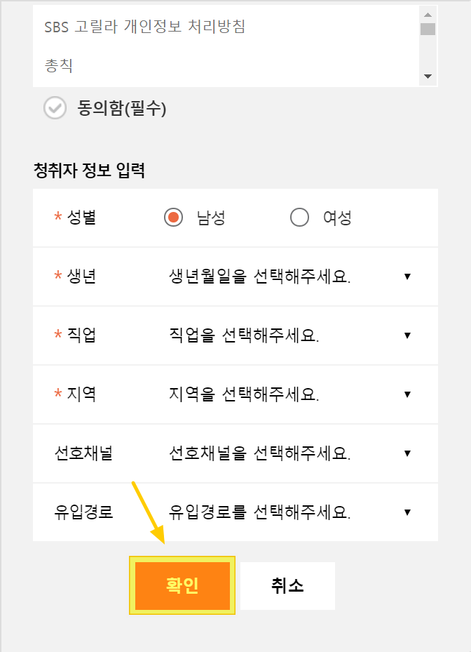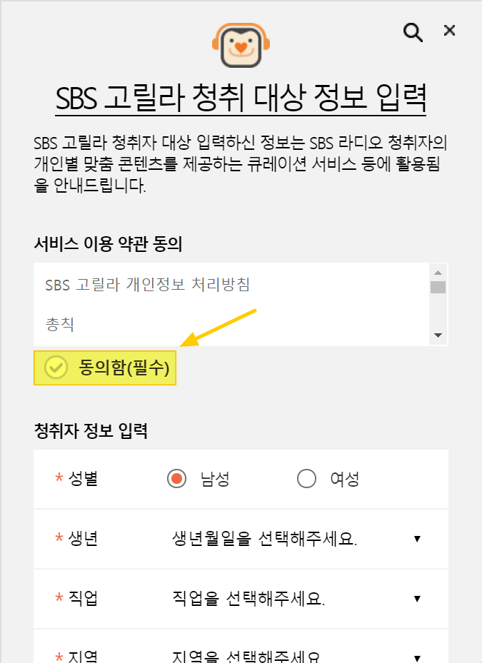 4. SBS고릴라를 다운로드 받으면 SBS 고릴라 청취 대상 정보 입력 칸이 뜹니다. 만약 맞춤 콘텐츠를 제공 받고 싶다면 [동의함] 클릭 후 정보 입력한 다음 [확인] 버튼 클릭하면 되고요.