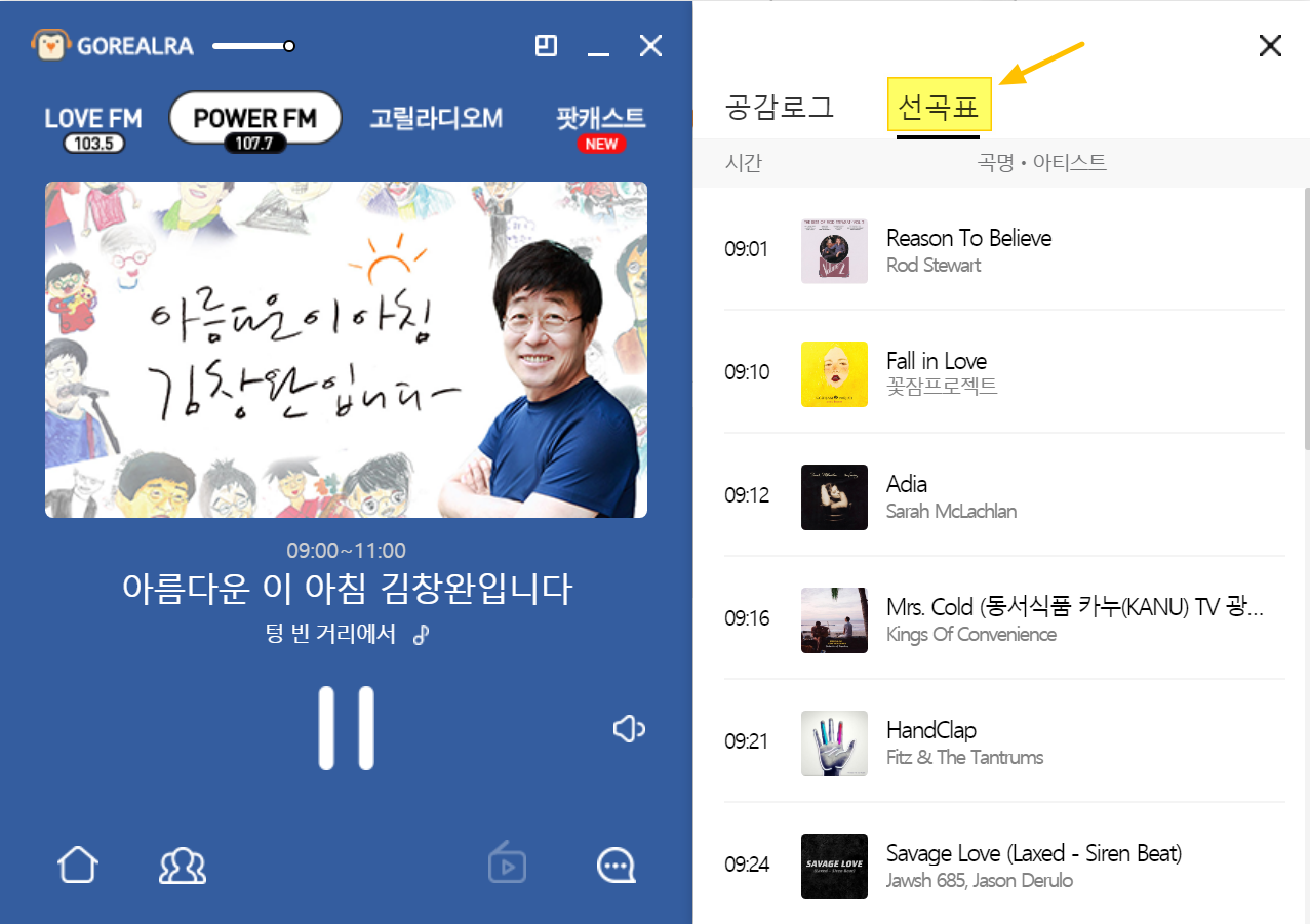 그 중 [선곡표]를 클릭하면 실시간으로 선곡표를 쫙 확인할 수 있습니다.