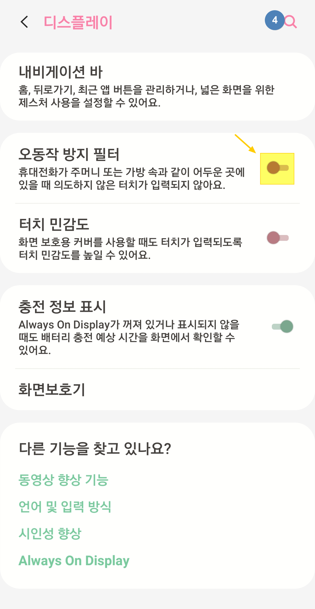 거의 밑에 쯤에 [오동작 방지 필터]가 있는데 왼쪽으로 되어있는 바를 오른쪽으로 옮겨주세요.