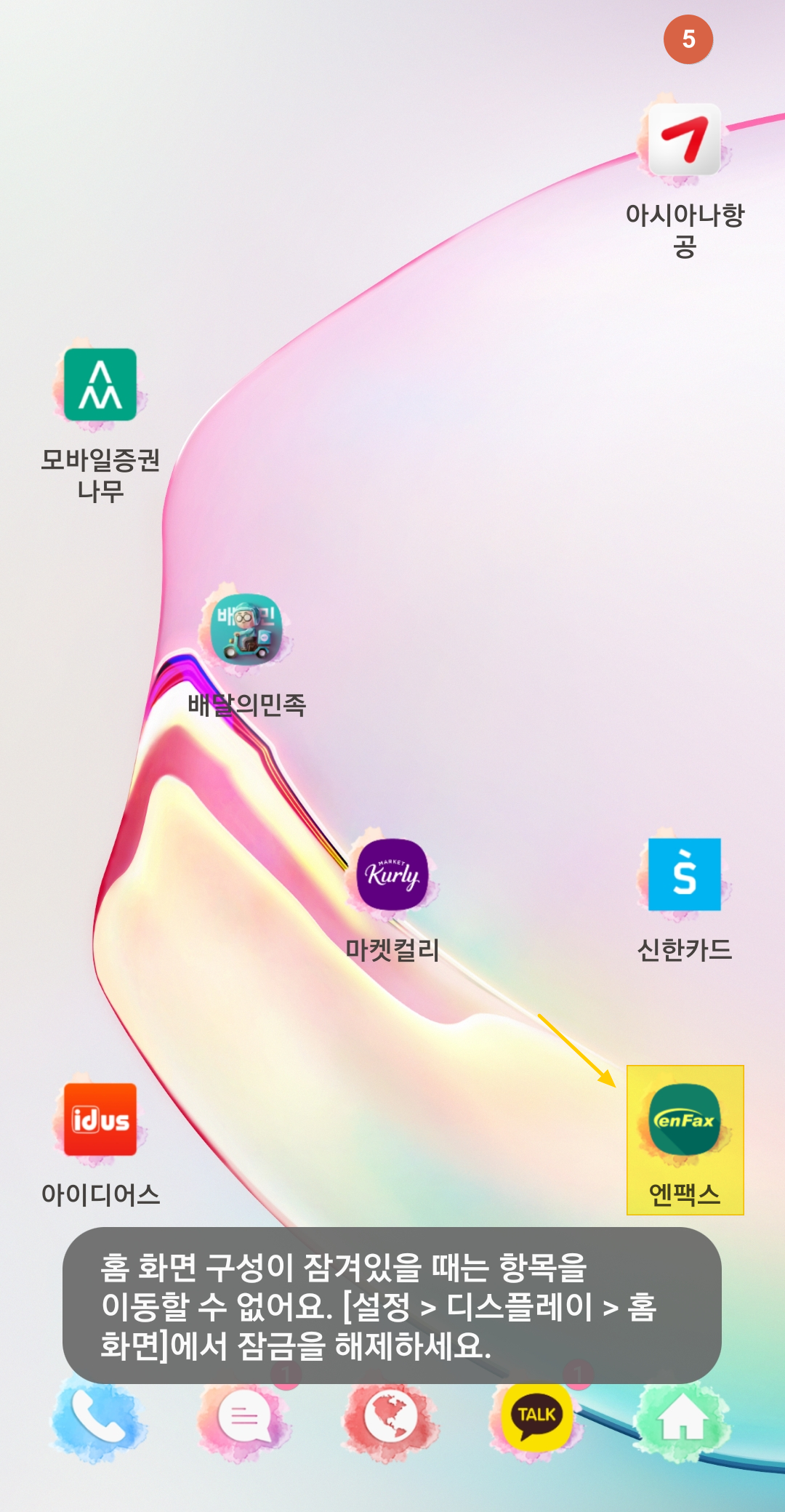 한번 테스트 해보면 정확히 알 수 있는데요. 휴대폰에 있는 엔팩스 어플을 누르고 이리저리 당겨보았더니 움직이지 않습니다.