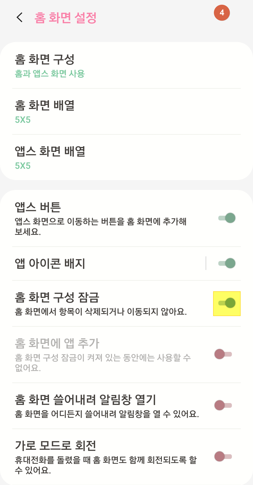 이 항목을 설정하면 홈화면에 있는 아이콘들이 움직이거나 삭제되지 않습니다. 바가 빨간색으로 뜨면 설정이 안 되어있는 상태고요. 이 바를 오른쪽으로 움직여주면 홈화면 구성 잠금이 설정됩니다.