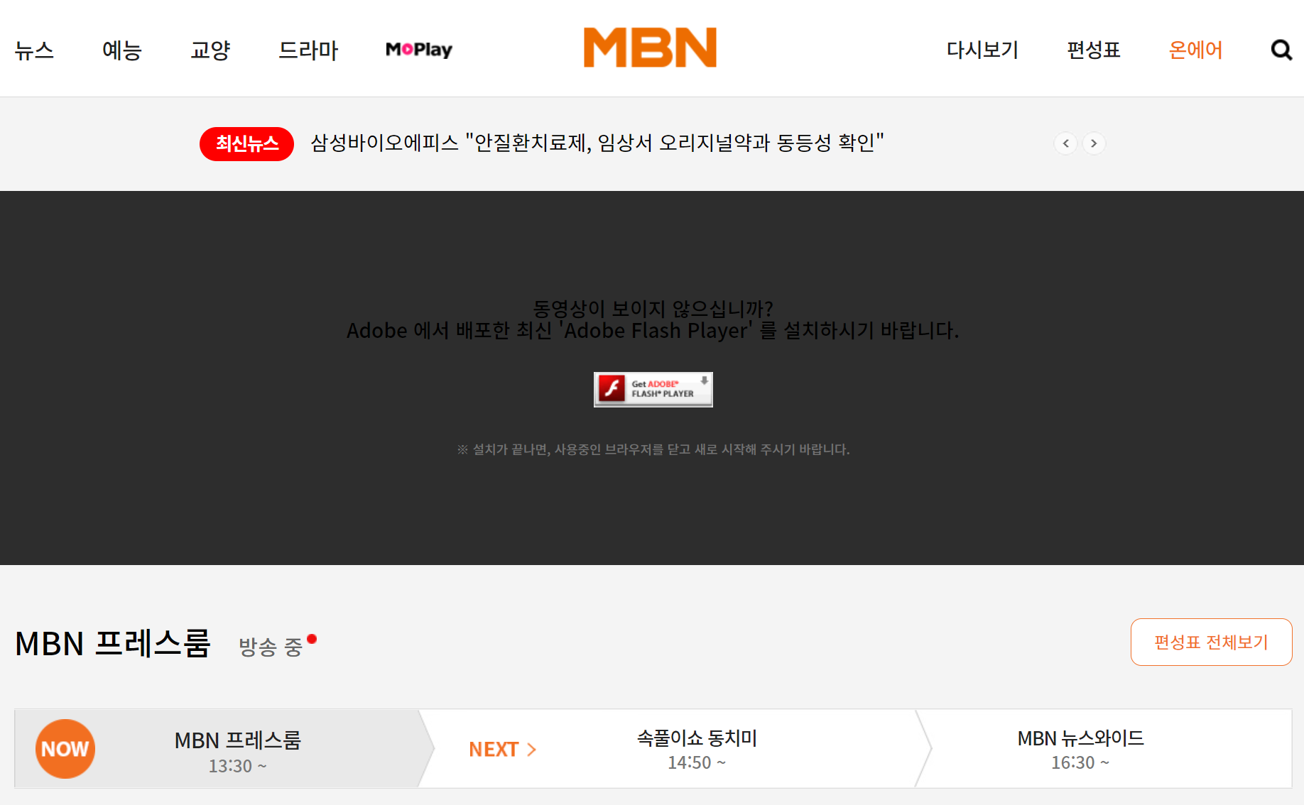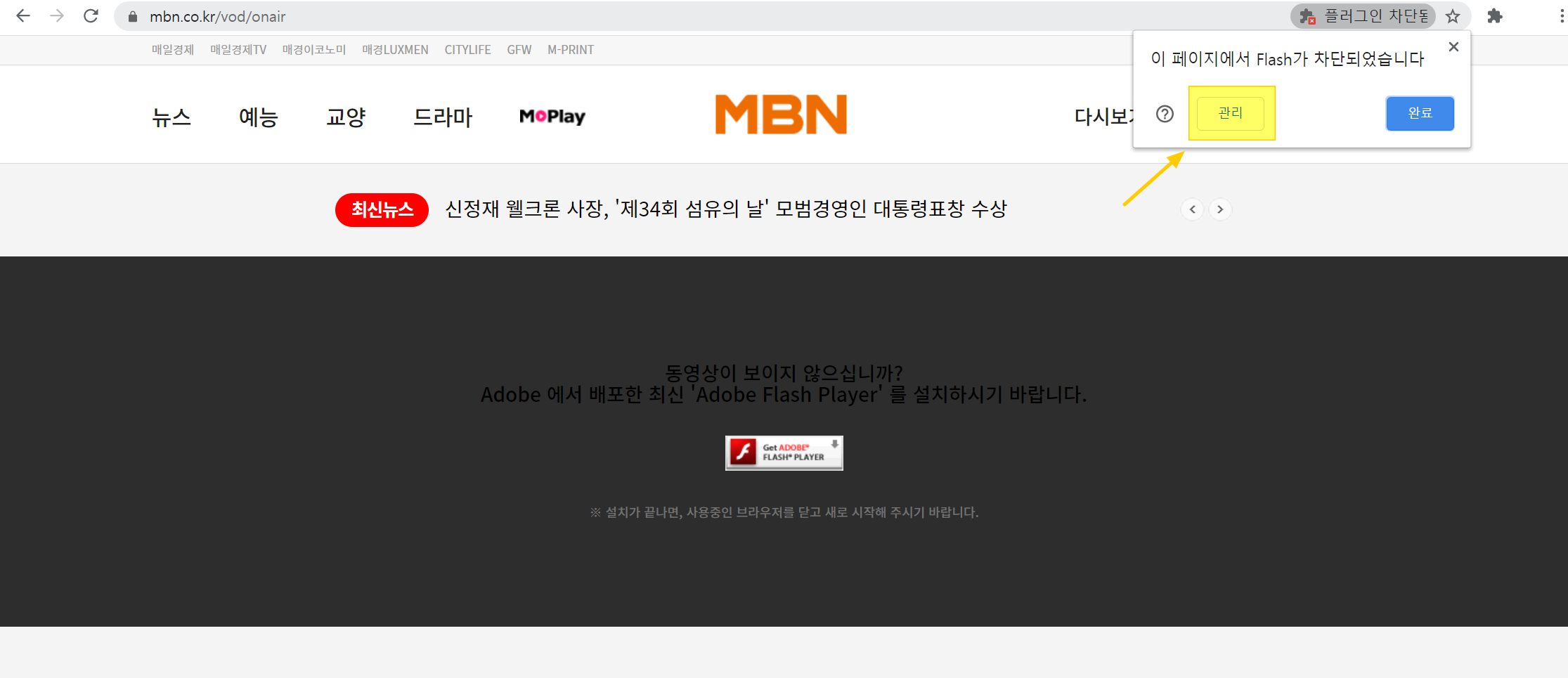 MBN 온에어를 보기 위해선 크롬 플래시 차단 기능부터 해제해야 합니다.