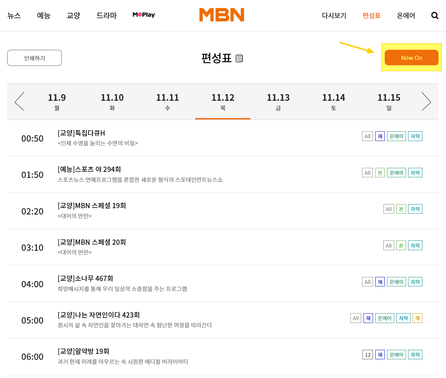 7. MBN 온에어에서는 실시간 편성표 역시 확인 가능합니다.