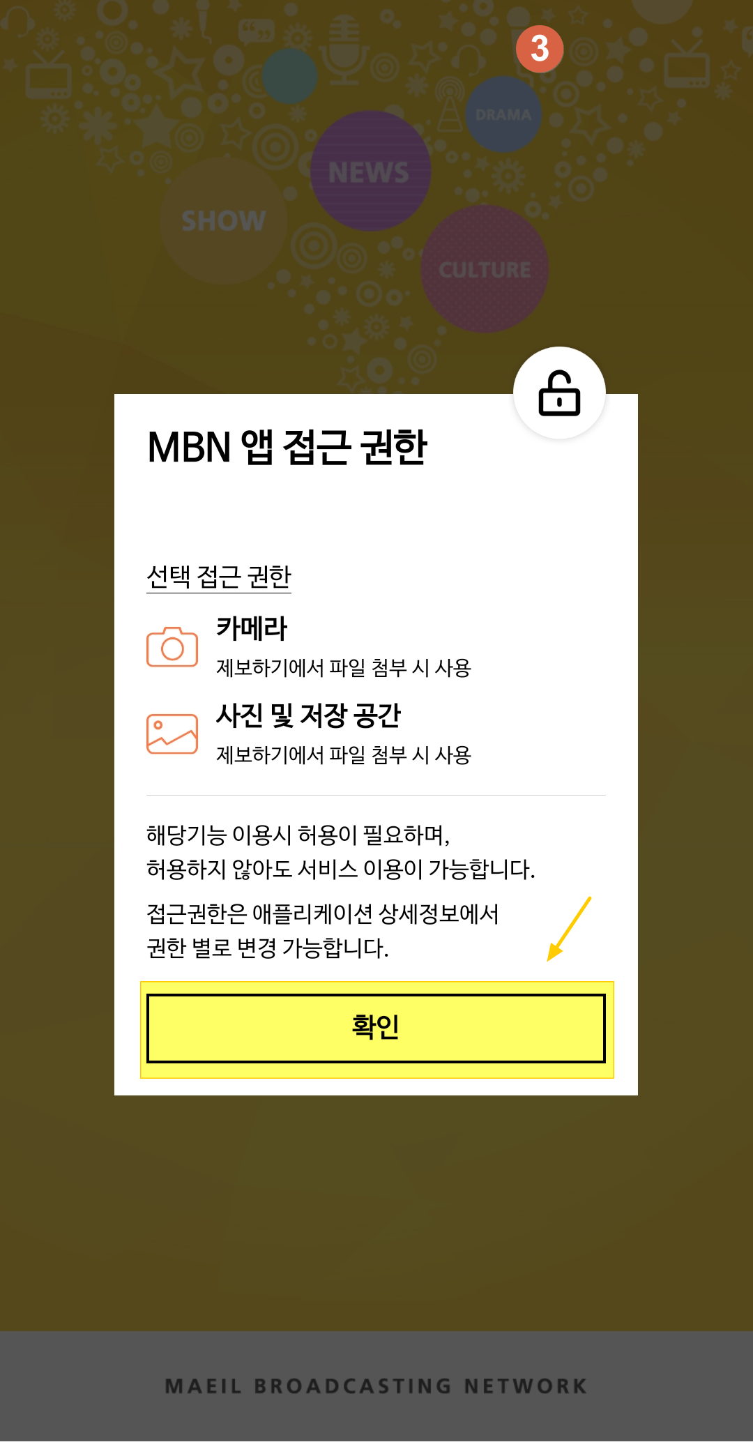 2. MBN앱 접근 권한이 뜨면 [확인] 버튼을 클릭합니다.
