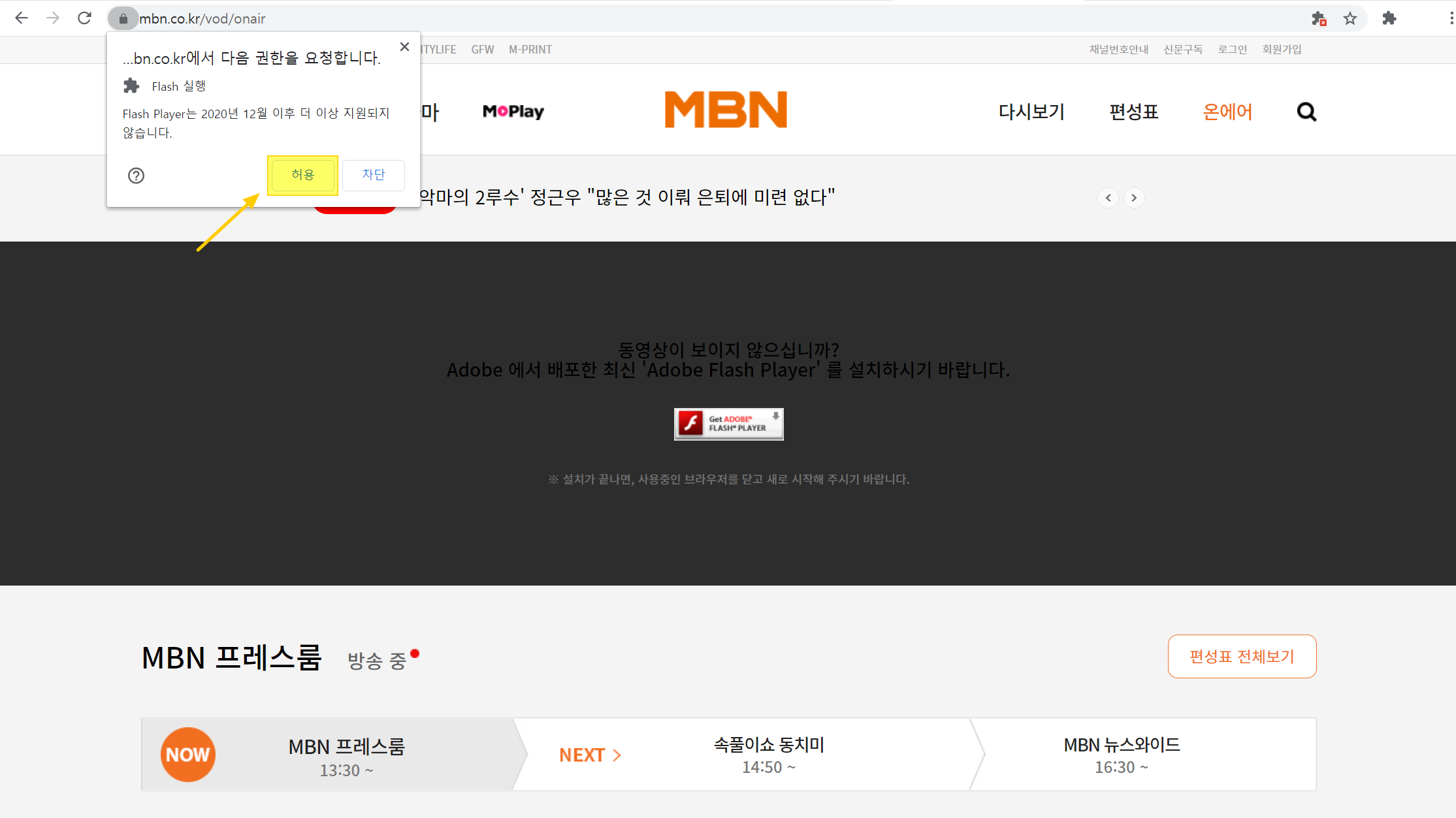 6. 여기까지 설정을 마친 후 다시 [MBN 온에어] 홈페이지에 들어가면, 왼쪽 상단에 권한 요청 창이 뜹니다. [허용] 버튼을 클릭합니다. 그렇게 하면 MBN 온에어를 시청 가능합니다.
