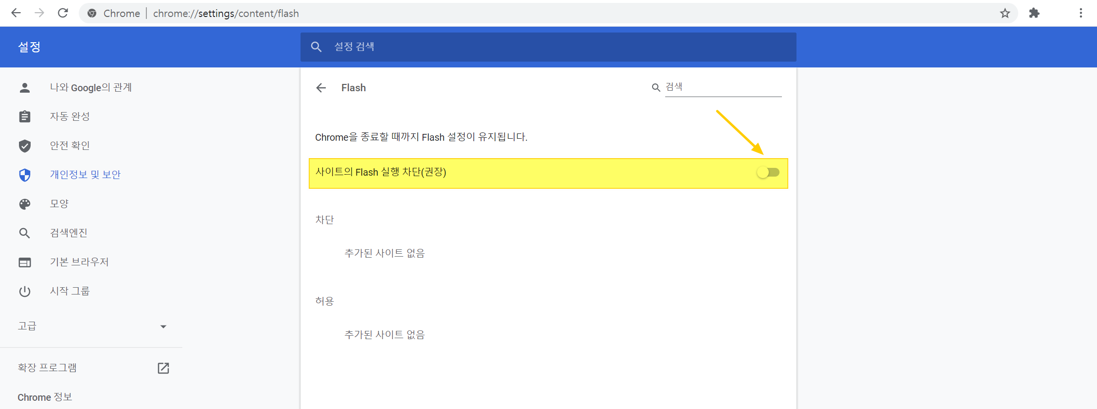 이 부분의 홰색 바를 오른쪽으로 옮기면 파란색이 되면서 플래시 실행 차단이 해제됩니다.