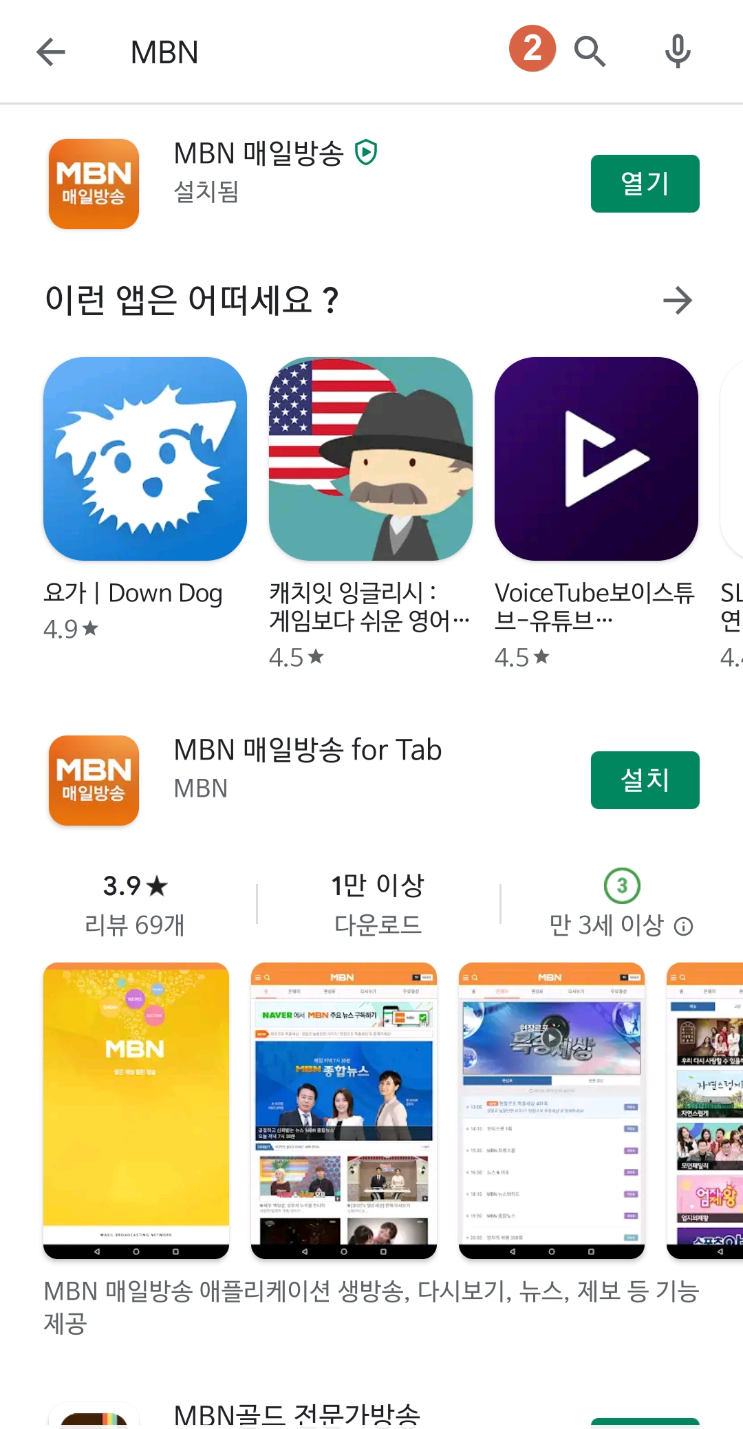 1. 플레이스토어나 앱스토어에서 [MBN]을 검색한 후 설치합니다.