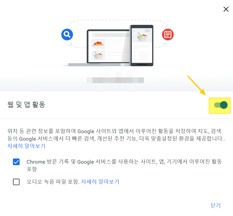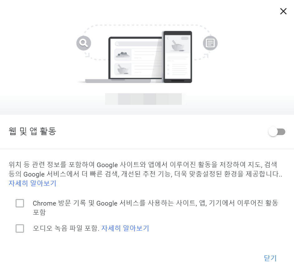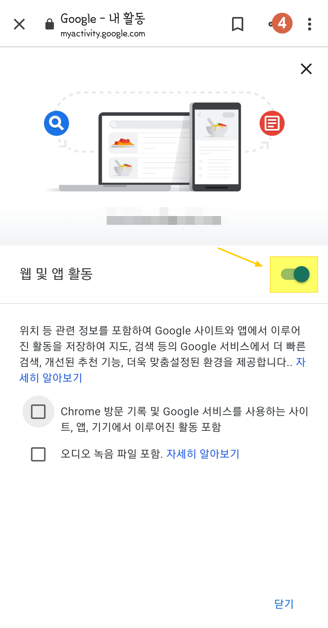 현재 웹 및 앱 활동 사용 중인 걸 알 수 있습니다. 이 부분을 비활성화 해주어야 합니다.