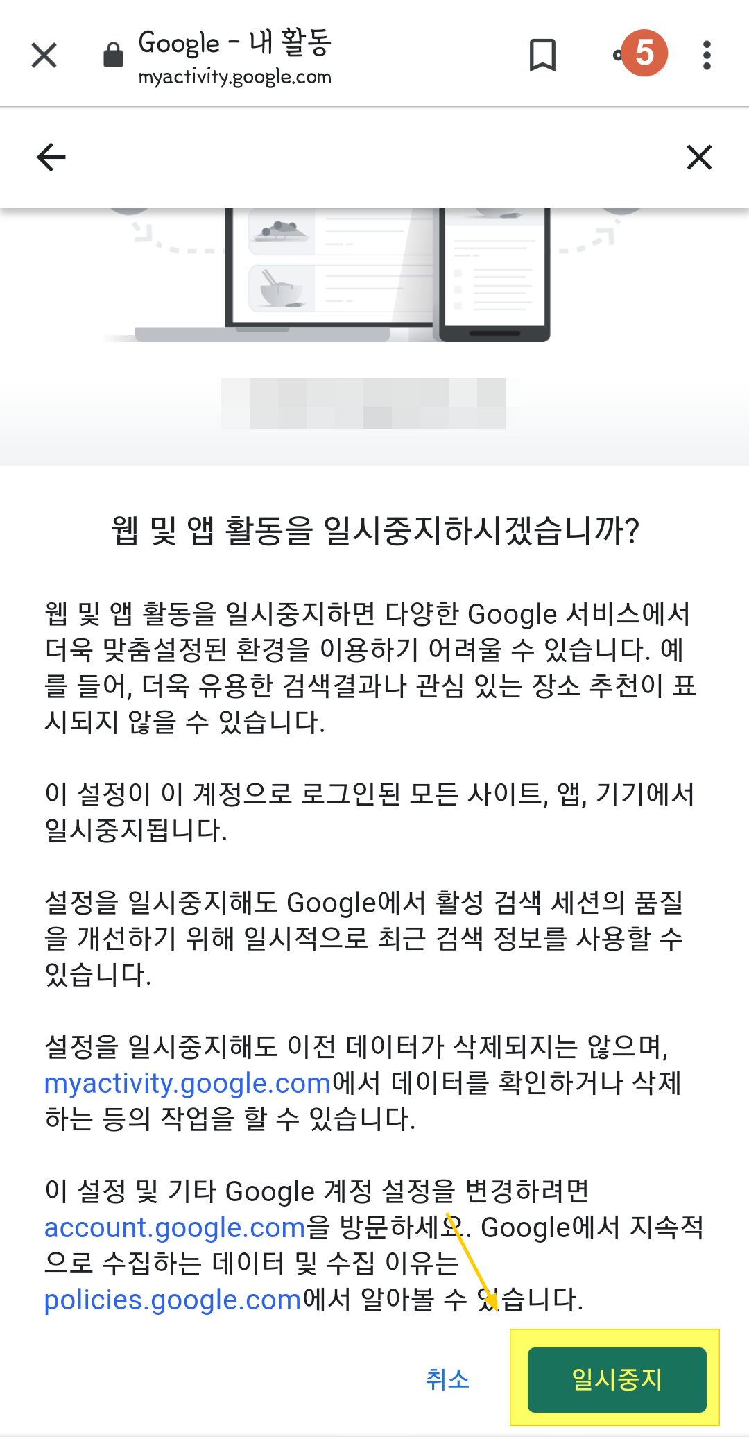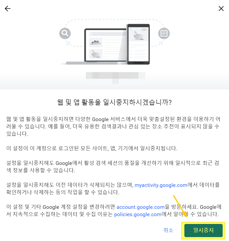 그러면 오른쪽 화면처럼 [웹 및 앱 활동을 일시중지하시겠습니까?]가 뜨는데 [일시중지]를 클릭합니다.