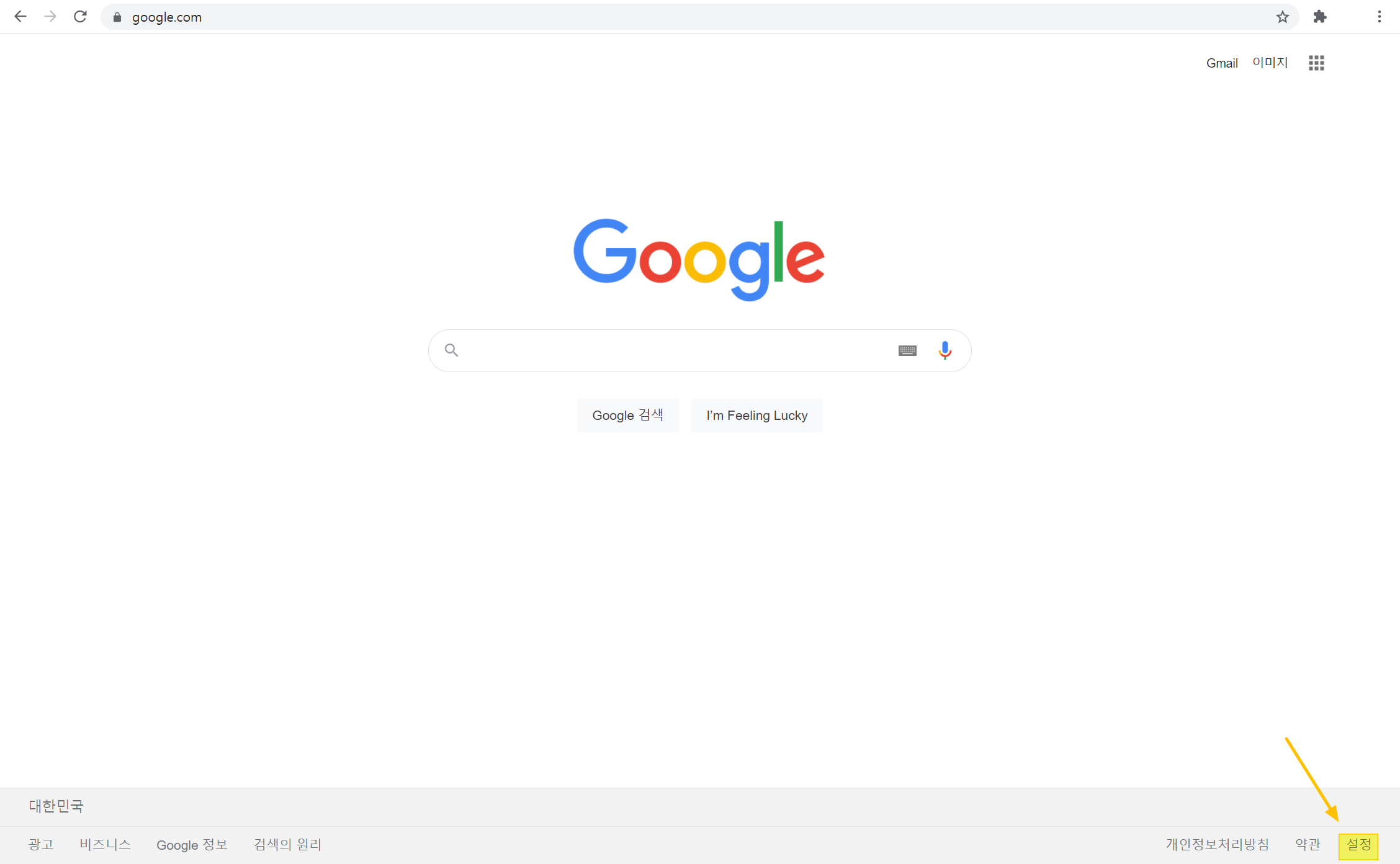 구글 사이트에 들어가면 제일 하단 오른쪽에 [설정]이 있습니다. 클릭해 주세요.