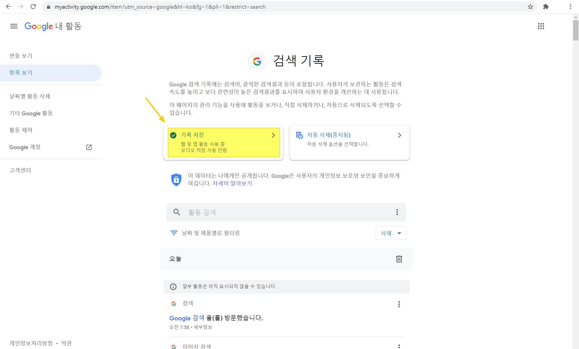 4. 기록 저장으로 들어가면 웹 및 앱 활동을 제어할 수 있습니다.