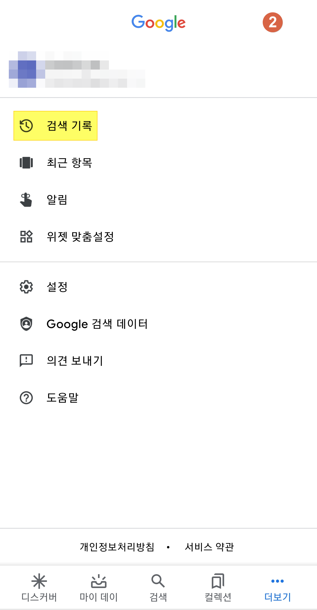 더보기 클릭 후 본인의 계정 바로 아래 있는 [검색 기록]을 클릭합니다.