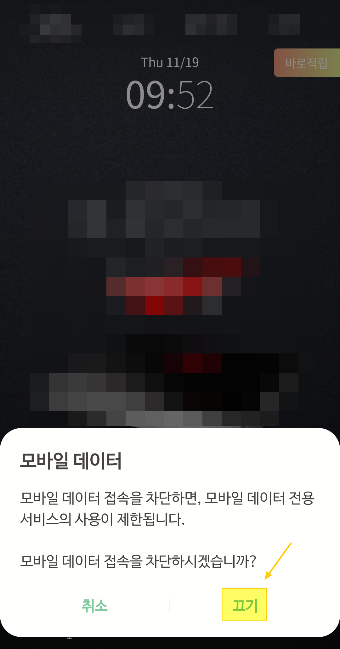 모바일 데이터 관련 창이 뜨면 [끄기]를 클릭합니다.