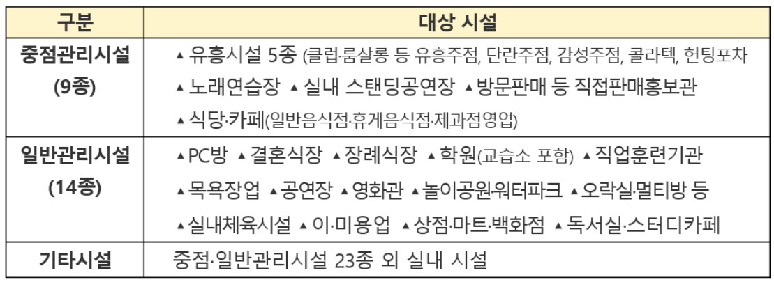 사회적 거리두기 관련 대상 시설은 중점관리시설 9종과 일반관리시설 14종, 기타시설로 나누어집니다.