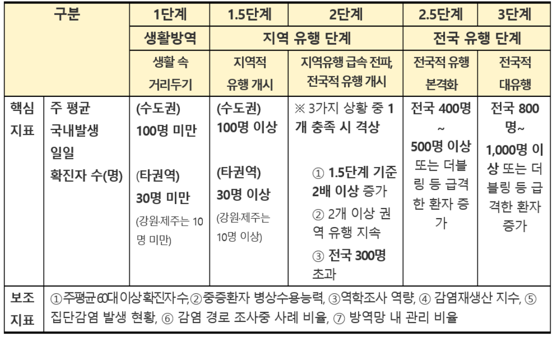 사회적 거리두기 1.5단계 기준 사항에서 2배 이상 증가하거나 2개 이상 권역에서 유행 지속될 경우.