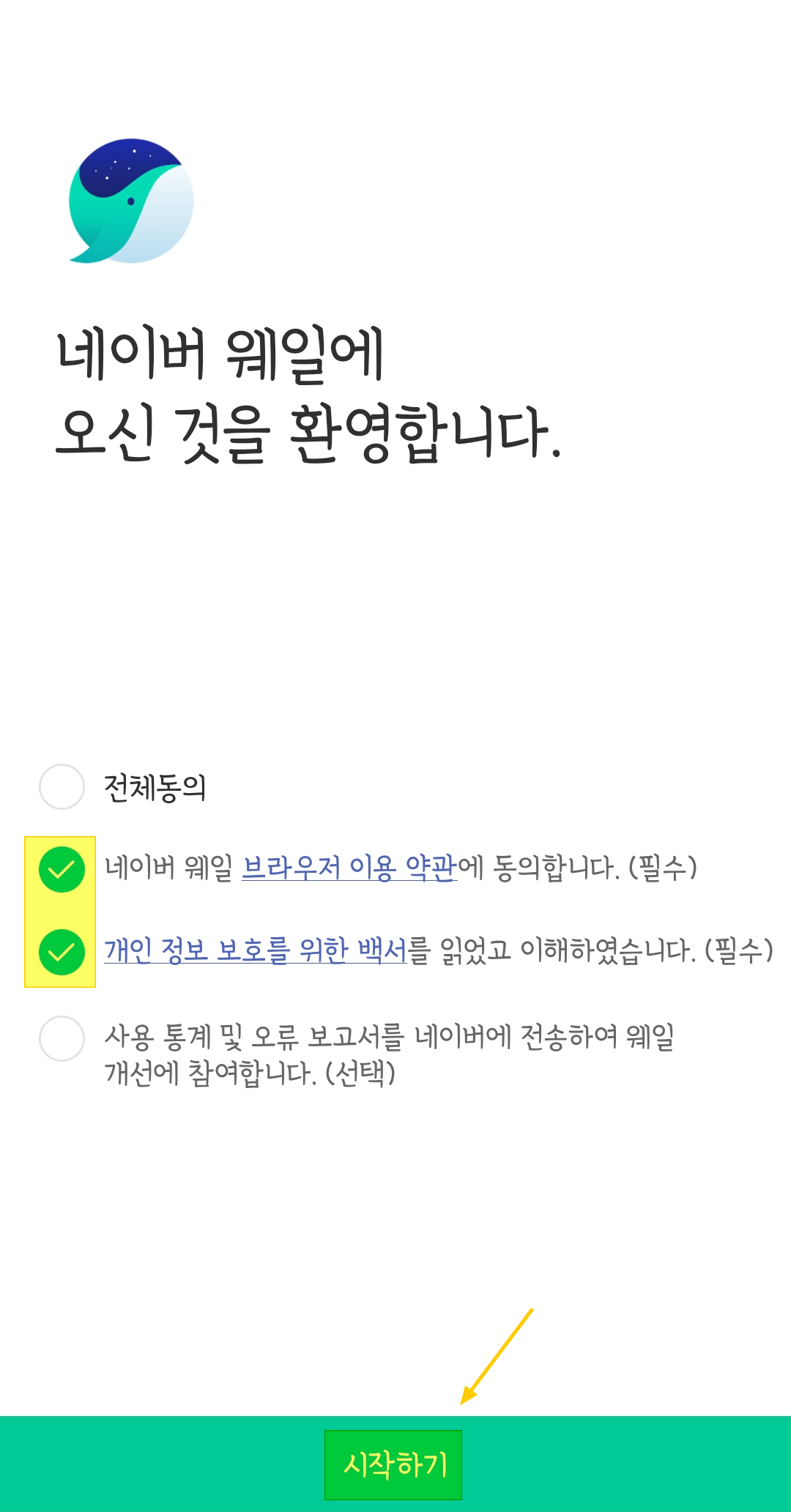 네이버 웨일 동의 부분에서 전체동의 안 하셔도 되고요. 첫 번째와 두 번째 항목만 [체크]한 후에 [시작하기] 버튼을 클릭합니다.