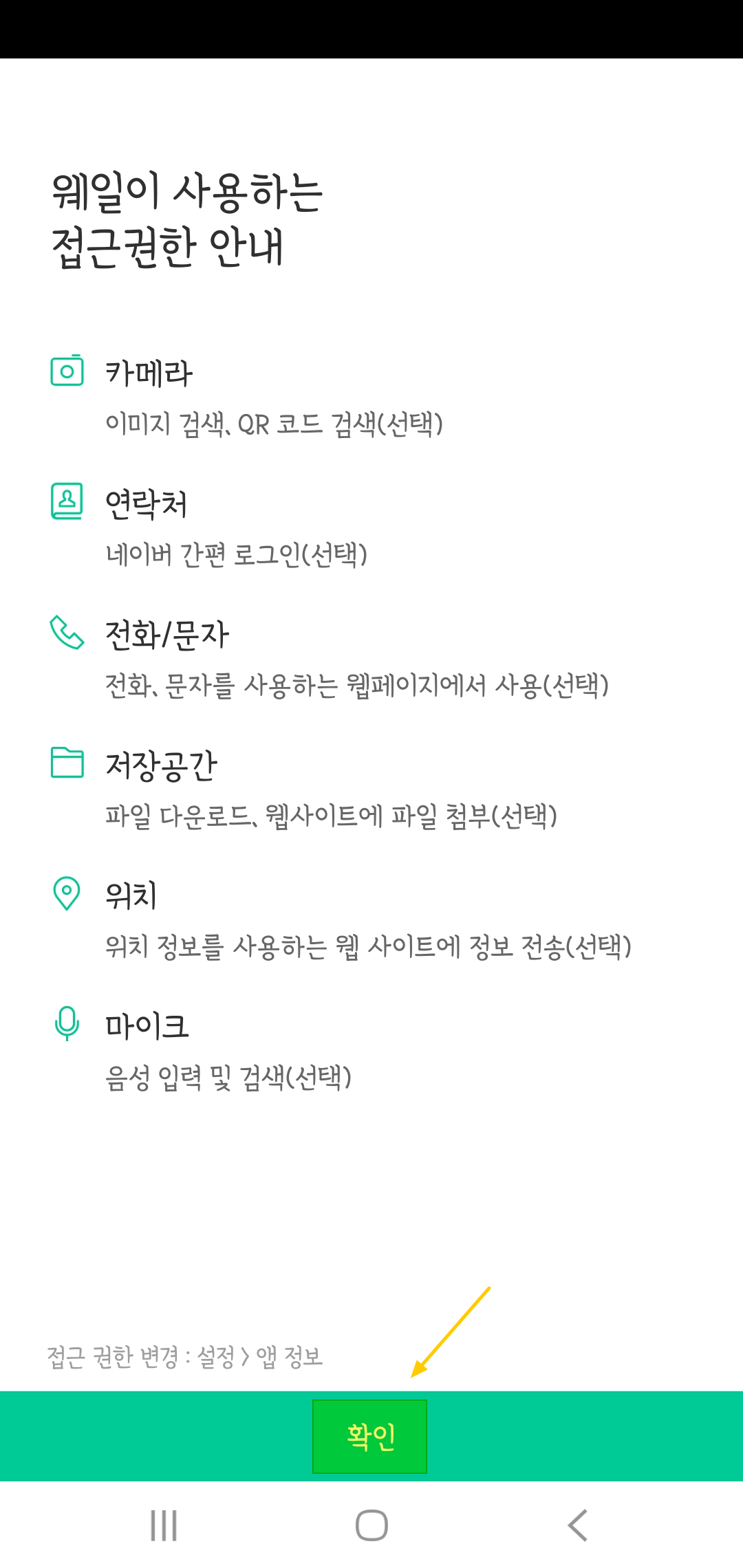 2. 웨일이 사용하는 접근권한 안내 창이 뜨면 가장 아래 있는 [확인]을 클릭합니다.