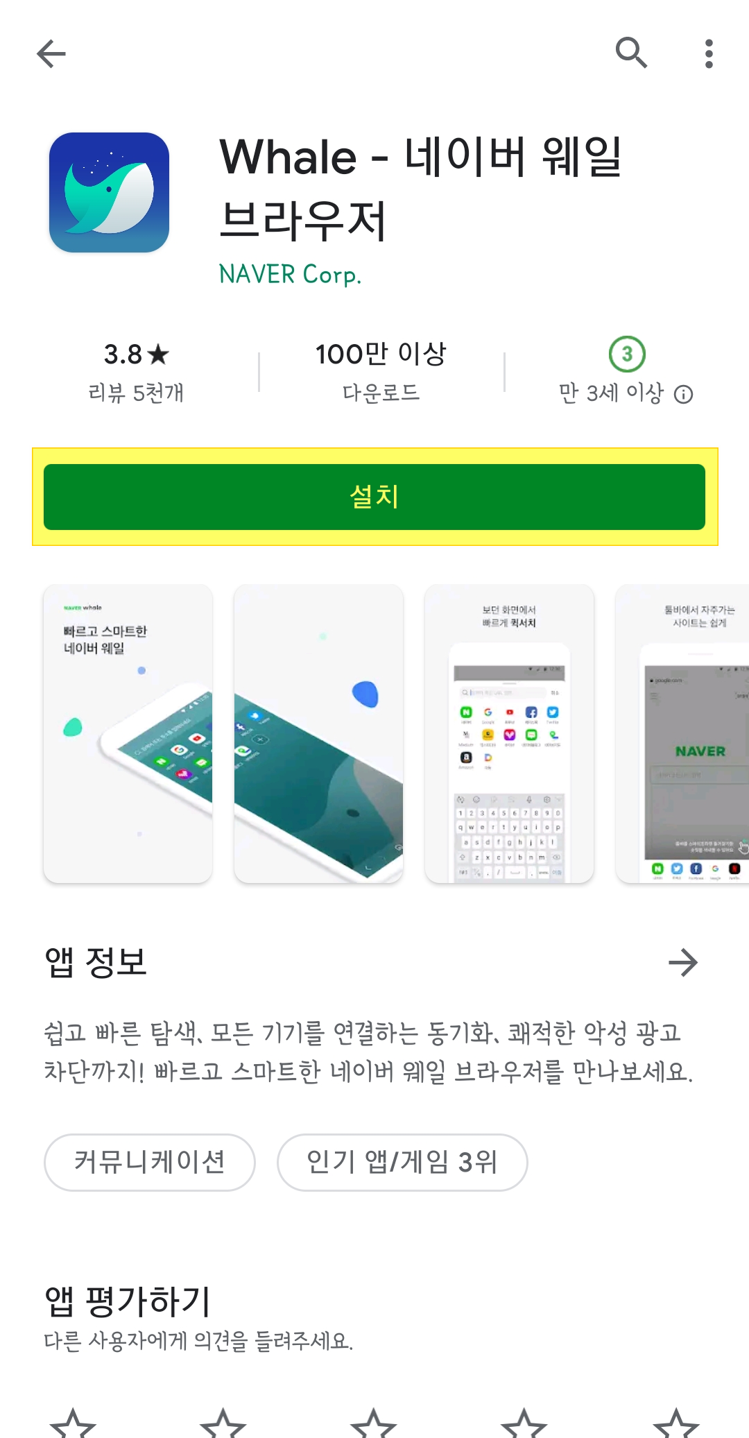 네이버 웨일 브라우저라는 앱이 뜨면 [설치]를 클릭한 후 다운로드 합니다.