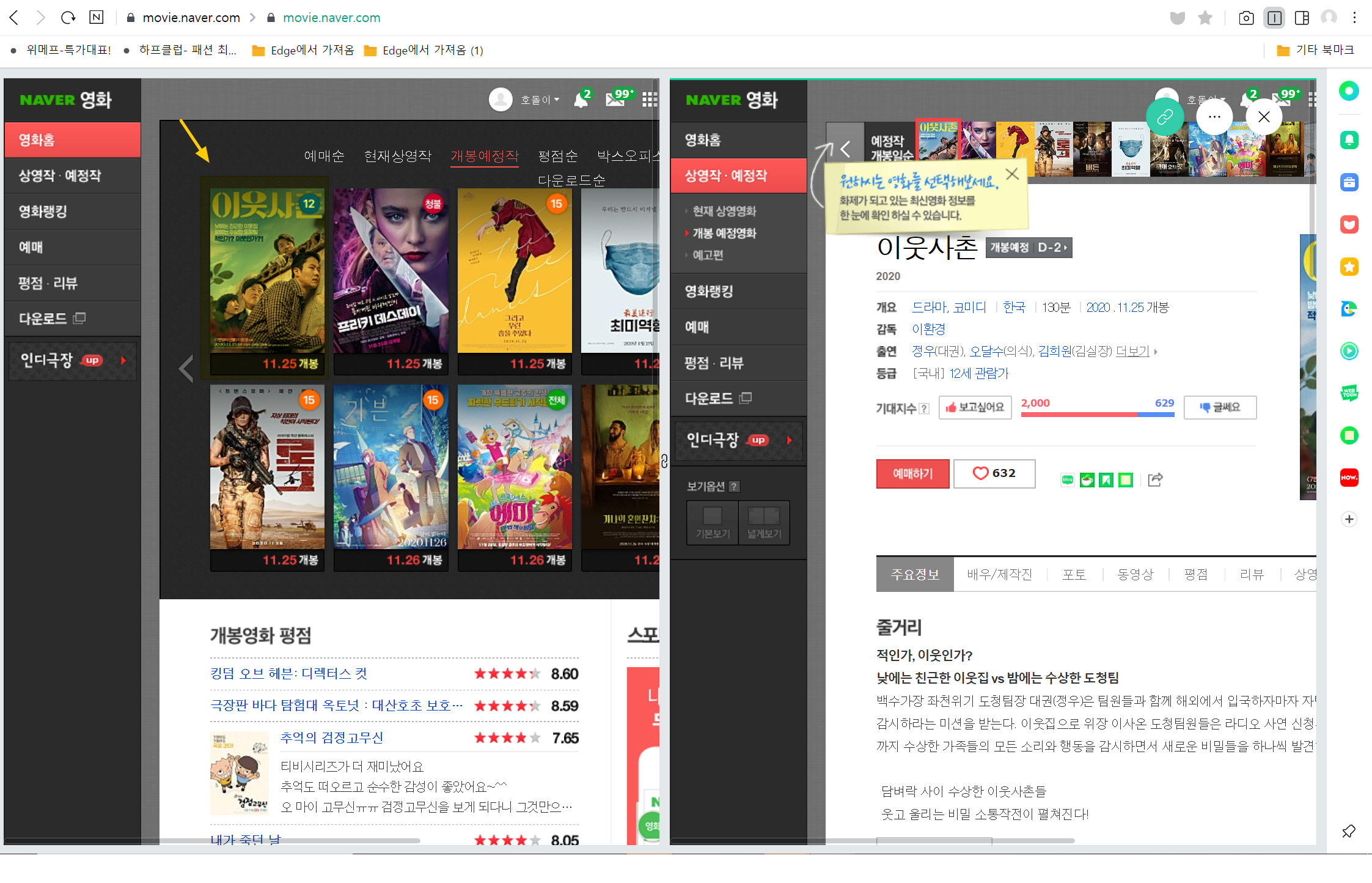 예를 들어 제가 왼쪽에 이웃사촌 영화를 클릭하면 그 내용이 오른쪽 창에 뜹니다.