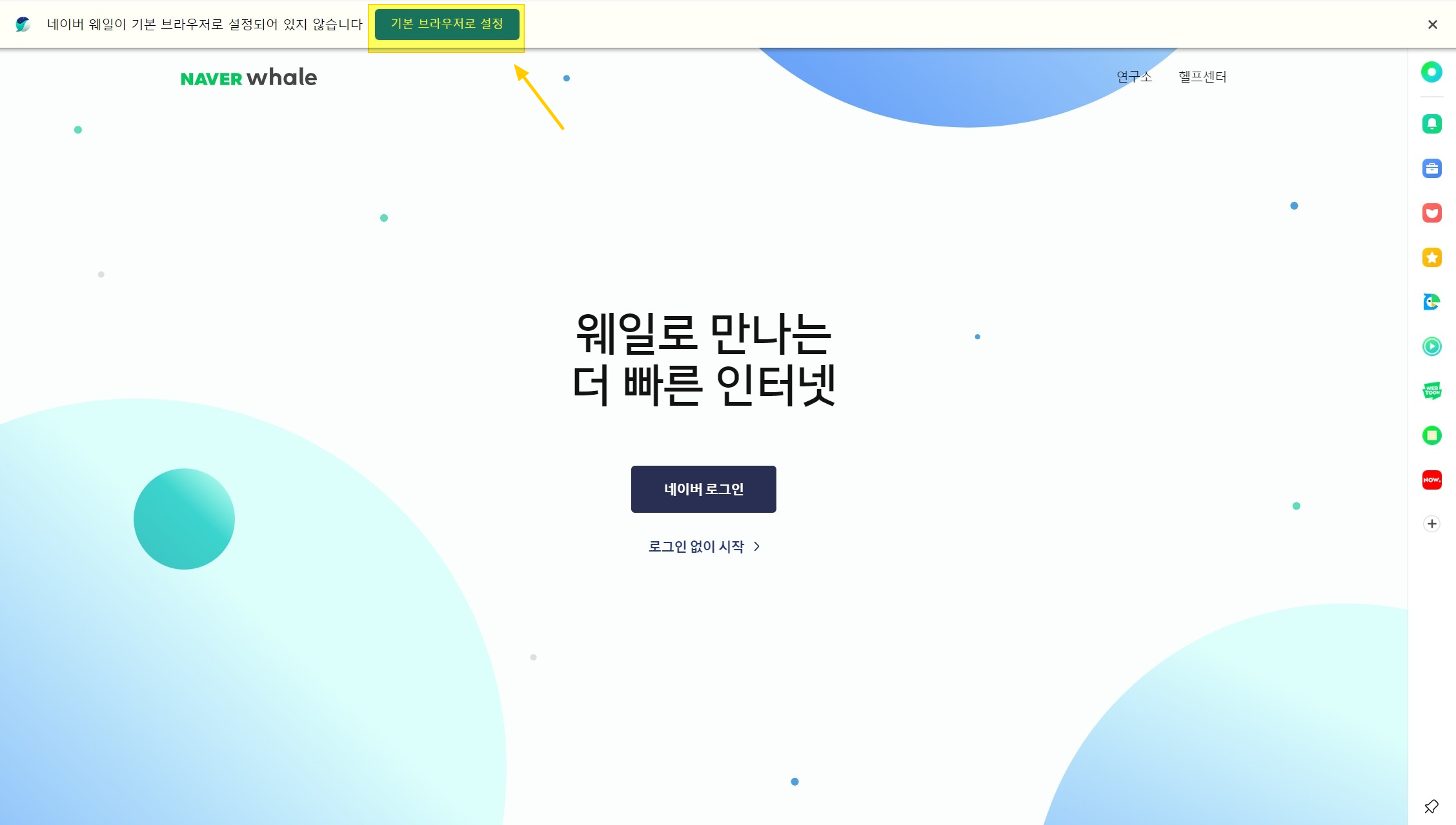 네이버 웨일을 기본 브라우저로 사용하고 싶다면 최상단에 위치한 [기본 브라우저로 설정]을 클릭하면 됩니다.