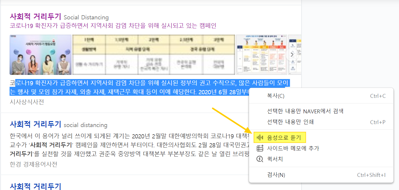 여러 설정들 중 [음성으로 듣기]를 클릭하면 바로 음성 재생됩니다.