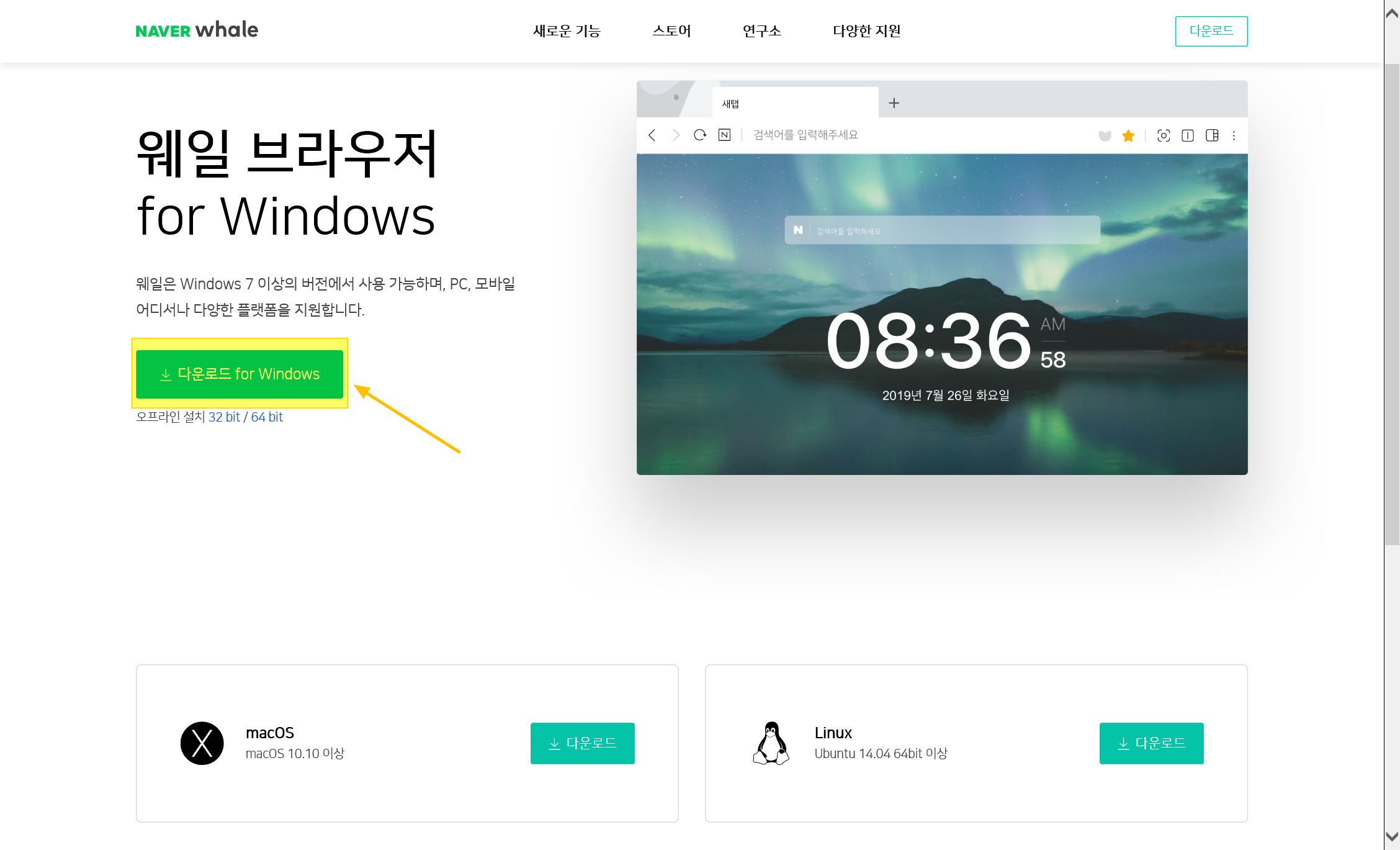 2. 네이버 웨일 다운로드 페이지에 들어가면 다운로드가 가능합니다.