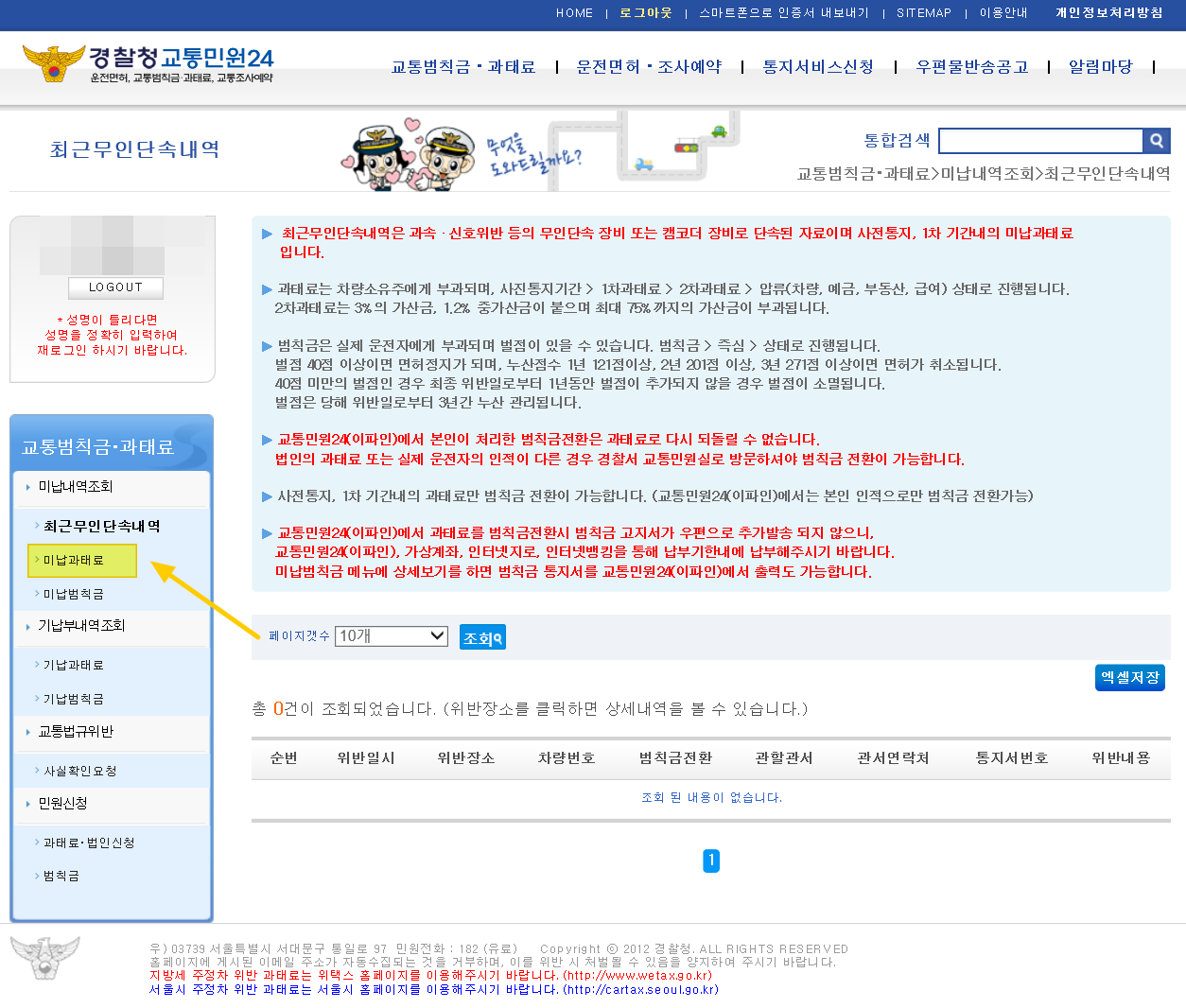 만약 최근 단속내역 말고 미납한 과태료나 법칙금을 보고 싶다면 왼쪽에 있는 [미납과태료]를 클릭합니다.