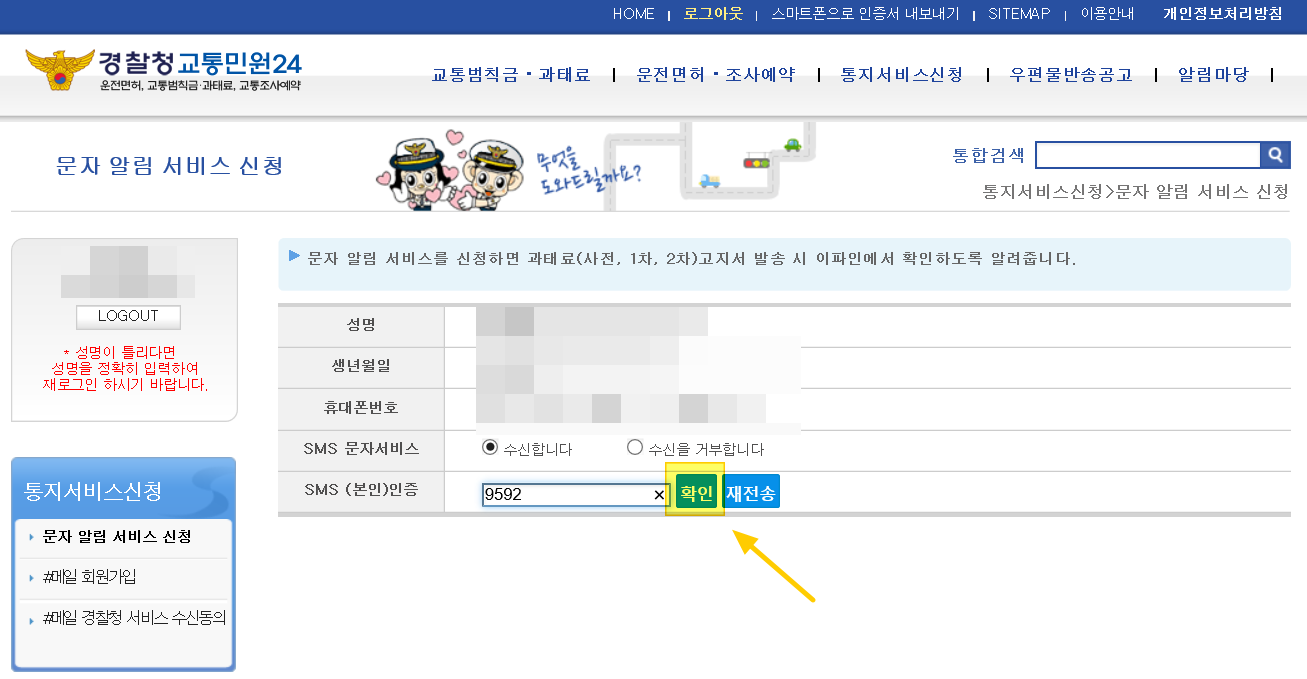 인증번호 입력한 다음 [확인] 버튼을 클릭합니다.