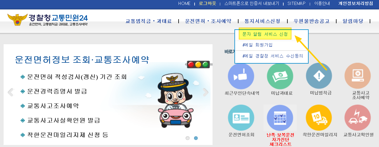 과속 단속 조회는 인터넷에서 실시간 확인도 가능하지만 미리 문자 서비스를 신청해 놓으면 과속 하고 고지서가 날라올 때 문자로 바로 알림을 받을 수도 있습니다.