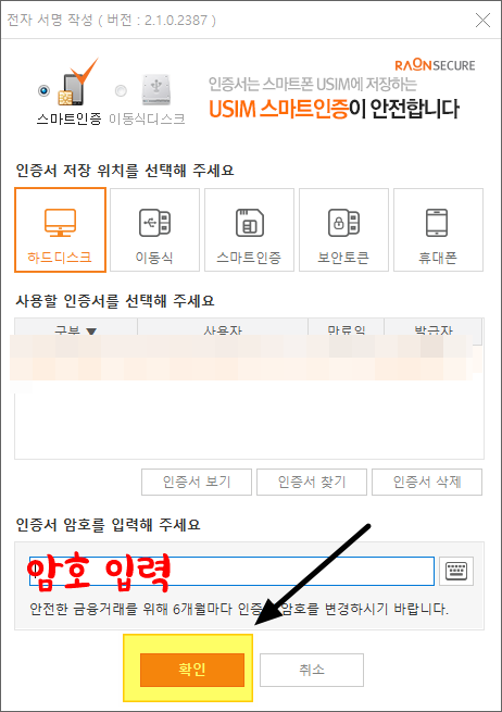 인증서 화면이 뜨면 본인이 가지고 있는 인증서 저장 위치를 선택한 후에 암호를 입력해 주고, [확인] 버튼을 클릭해 주세요.